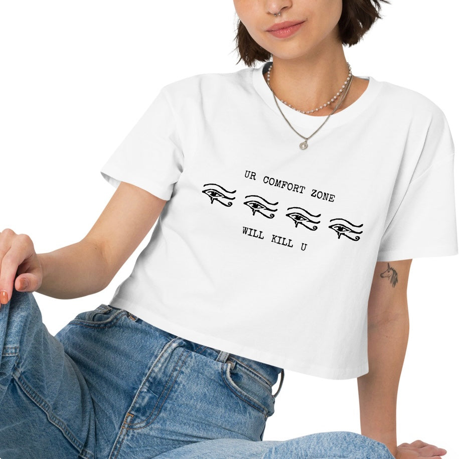 The striking ‘Comfort Zone’ graphic print serves as a playful reminder that real growth happens when we dare to venture beyond our familiar boundaries. While you're stepping outside your comfort zone, the Eye of Horus has your back, offering you an extra layer of spiritual protection. 👁️🌙